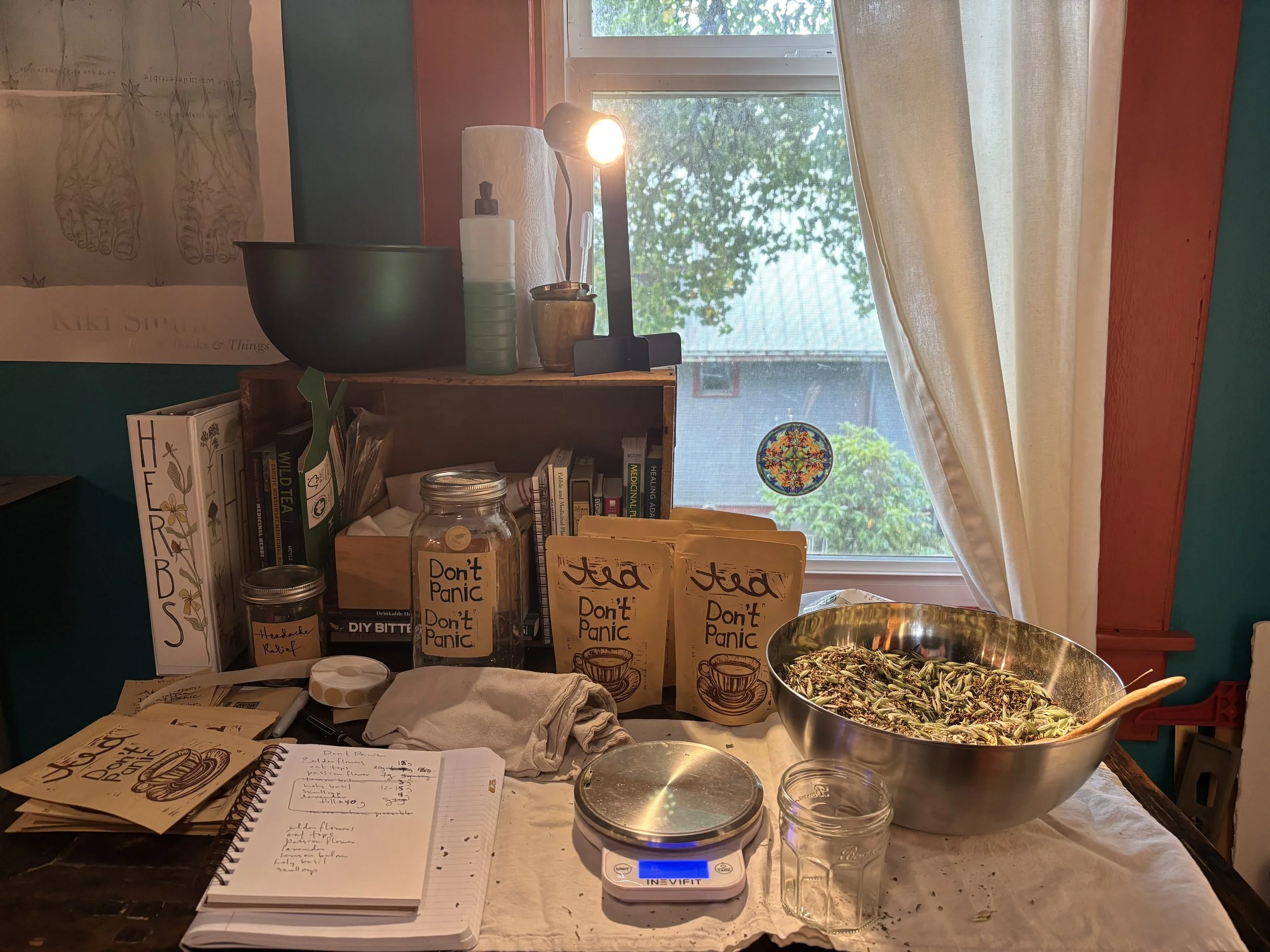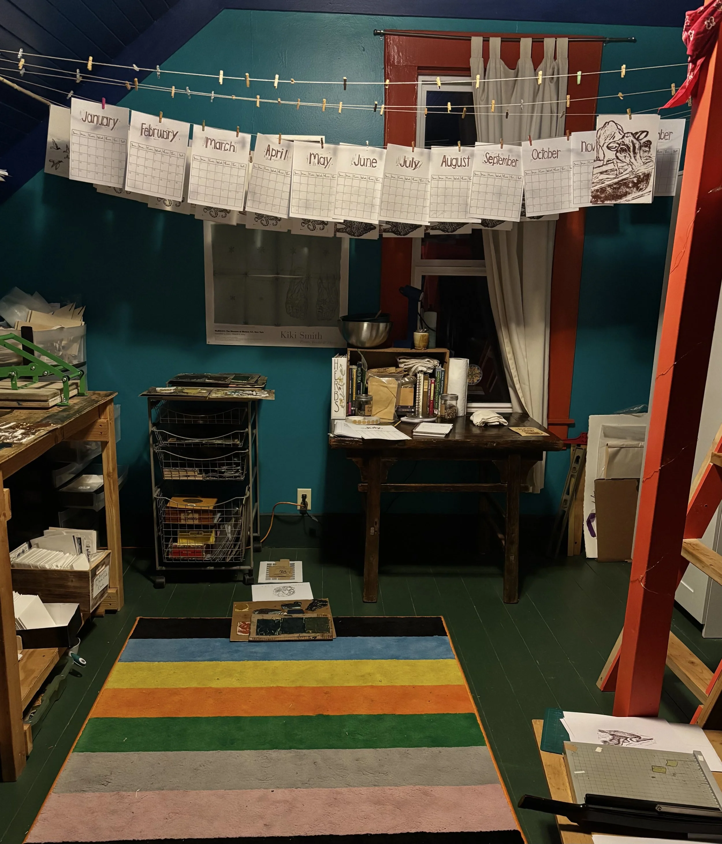 My studio is a room in my house where I go to make a mess over and over again until I end up creating something I like well enough to keep around for a while, whether it’s a new block print or a new blend of herbs for tea.