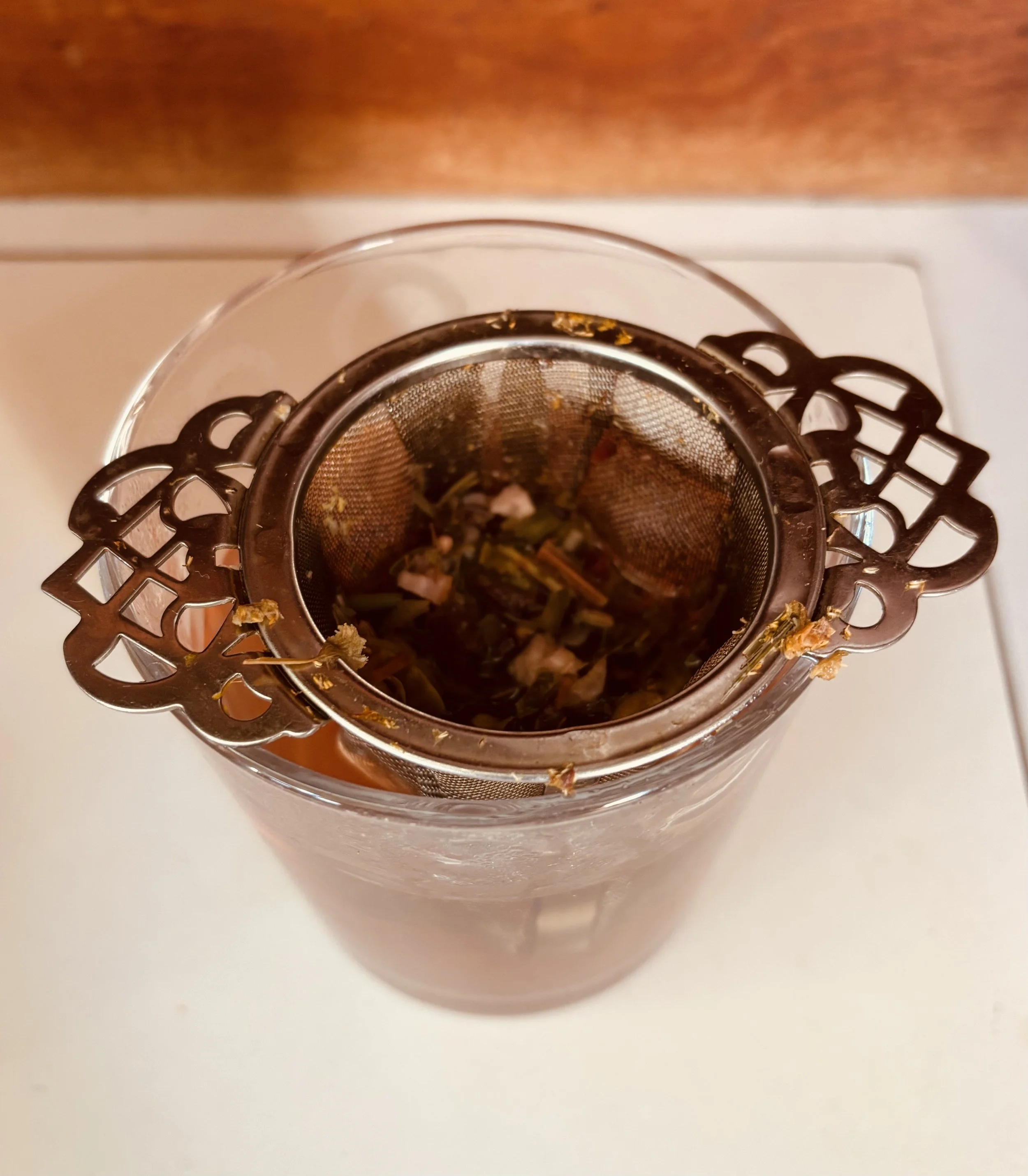 Follow the instructions above and let it simmer for 10 or even 15 minutes. I generally like a strong cup and I will let it simmer for about 12 or 15 minutes and then add a big spoonful of honey before straining. For Not Coffee or Turmeric Orange, I will then heat up oat milk and add it to the cup. It’s like an herbal latte!